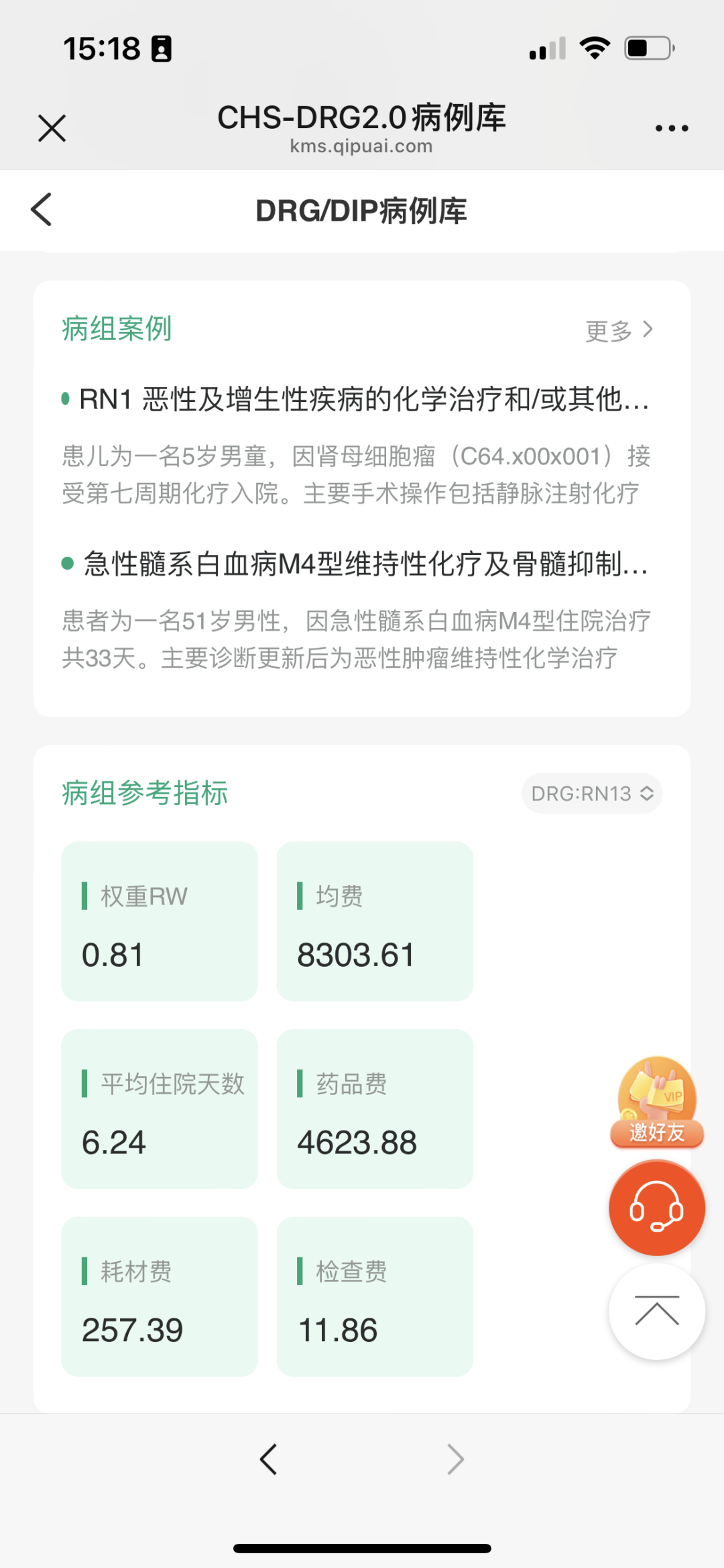- 病组参考指标展示:权重、均费、次均住院天数、药品费、耗材费、检查费