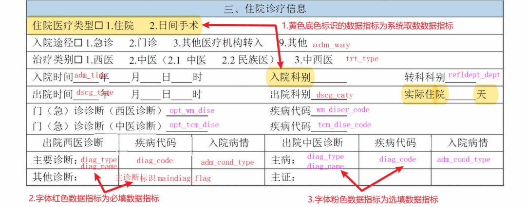 当医疗类型为住院(含日间手术)时应当填写(以下简称住院清单),住院清单中门诊慢特病诊疗信息部分无须也不应填写。住院诊疗信息包括四部分,一是出入院,记录反映参保患者入院途径、时间、出院状态、方式及医护人员等住院诊疗信息;二是诊断,记录参保患者疾病诊断相关信息;三是手术操作,记录参保患者治疗方式;四是护理,反映参保患者住院期间护理情况。数据指标共58项,其中,系统取数数据指标9项,必填数据指标19项,选项数据指标30项。